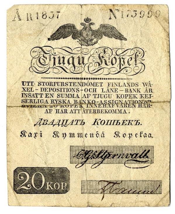 Это исторически значимая ассигнация номиналом 20 копеек, выпущенная в 1837 году для Великого Княжества Финляндского, автономной части Российской Империи. Эти банкноты выпускались Банком обмена, депозитов и займов Финляндии (позднее Банком Финляндии) и представляли собой депозиты российских имперских ассигнаций, функционируя как форма местной валюты в Великом Княжестве. Многоязычный дизайн банкноты, включающий тексты на шведском, русском и финском языках, является свидетельством уникального административного статуса Финляндии и ее культурного ландшафта под российским правлением. Отчетливо изображенный имперский двуглавый орел символизирует верховную власть российского царя. Эта конкретная ассигнация имеет серийный номер N° 173999 и год выпуска 'ÅR 1837'. Она относится к периоду выпуска российских ассигнаций 1819-1843 годов. Видна подпись Г. В. Штернвалля, который был директором Банка Финляндии, что добавляет важную историческую связь к банкноте. Эта банкнота ценна для коллекционеров своим историческим контекстом, многоязычным текстом и связью как с имперской российской, так и с финской банковской историей. Примечание: Номинал составляет 20 копеек, что равно 0.2 рубля, и, следовательно, не соответствует предоставленному списку целых номиналов в рублях.